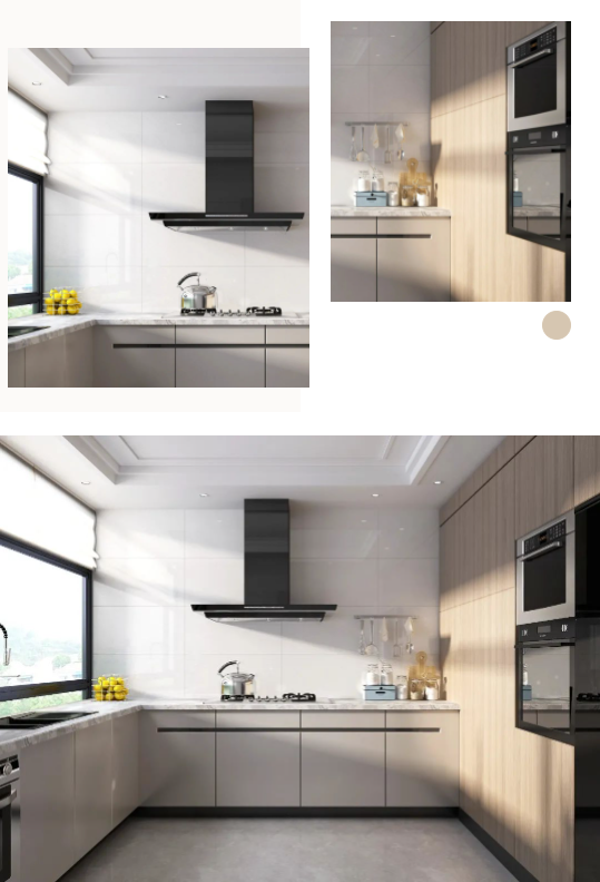 墻面通體瓷拋石中板馬特拉,清爽的色調(diào)既拓寬了廚房的空間感,一石多面又增添了些許靈動(dòng),在陽光照射下,與暖調(diào)木紋互相輝映,建立起空間與自然之間的聯(lián)系,讓每次下廚都成為期待。