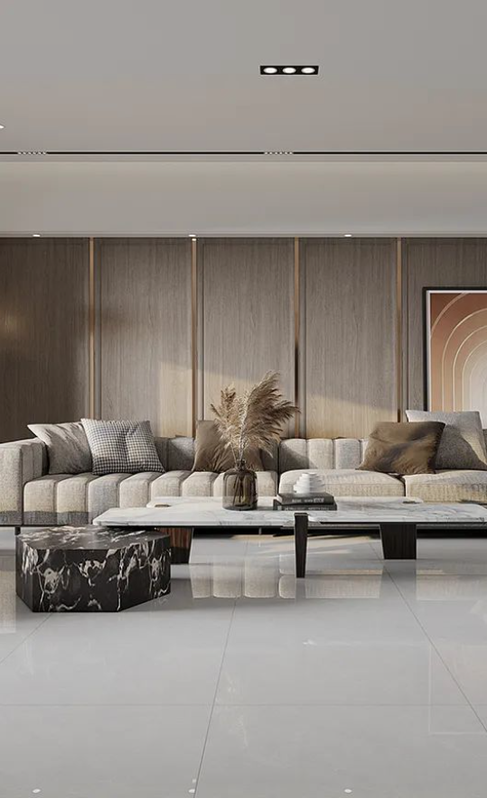 客廳放眼望去平靜質(zhì)樸,原木及亞麻裝飾配以喜翡穩(wěn)步磚細(xì)膩的穩(wěn)重質(zhì)感,意在打造“穩(wěn)中求進(jìn)”的生活空間和自然氣息。