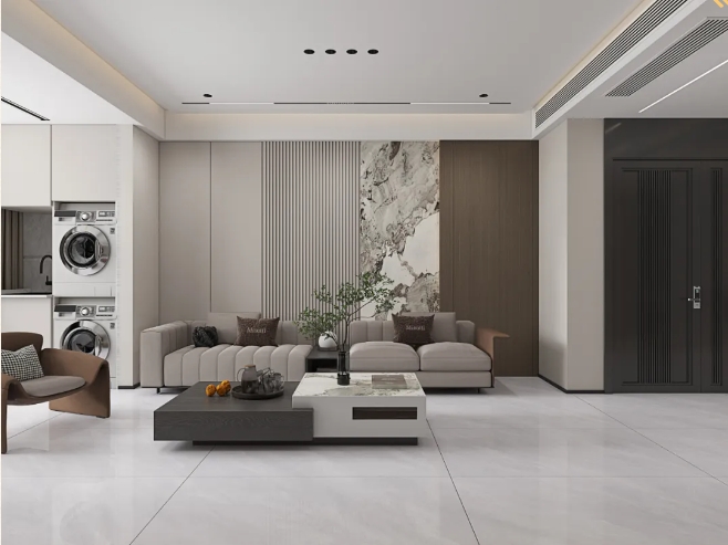 以希臘灰大面積鋪貼空間,其設計感恰似天然水墨鋪展,光影交織間,延伸空間質感,演繹出優雅的生活格調。